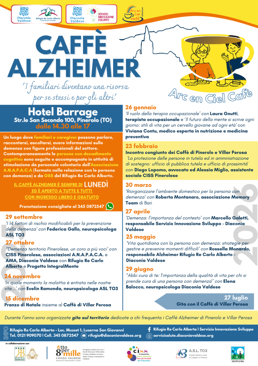 Il Caffè Alzheimer di Pinerolo è un progetto sostenuto con i fondi 8×1000 della Chiesa Valdese (Unione delle Chiese Metodiste e Valdesi) che vede la partnership del C.I.S.S.  Pinerolese, ASL TO3, Associazione ANAPACA di Pinerolo e la collaborazione dell’Hotel Barrage. L’ingresso è libero e gratuito ma è possibile prenotare tramite whatsapp scrivendo al numero 345 0872547.