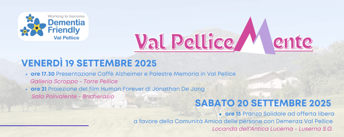 Si inizia venerdì 19 settembre alle 17.30, presso la Galleria Civica Scroppo (via Roberto  D’Azeglio, 10) a Torre Pellice con la presentazione del nuovo Caffè Alzheimer e delle  Palestre della Memoria (ingresso libero) e si prosegue con la proiezione del docufilm  Human Forever di Jonathan De Jong al Polivalente di Bricherasio, in piazza Don Vittorio  Morero, 2 (Ingresso libero fino ad esaurimento posti).