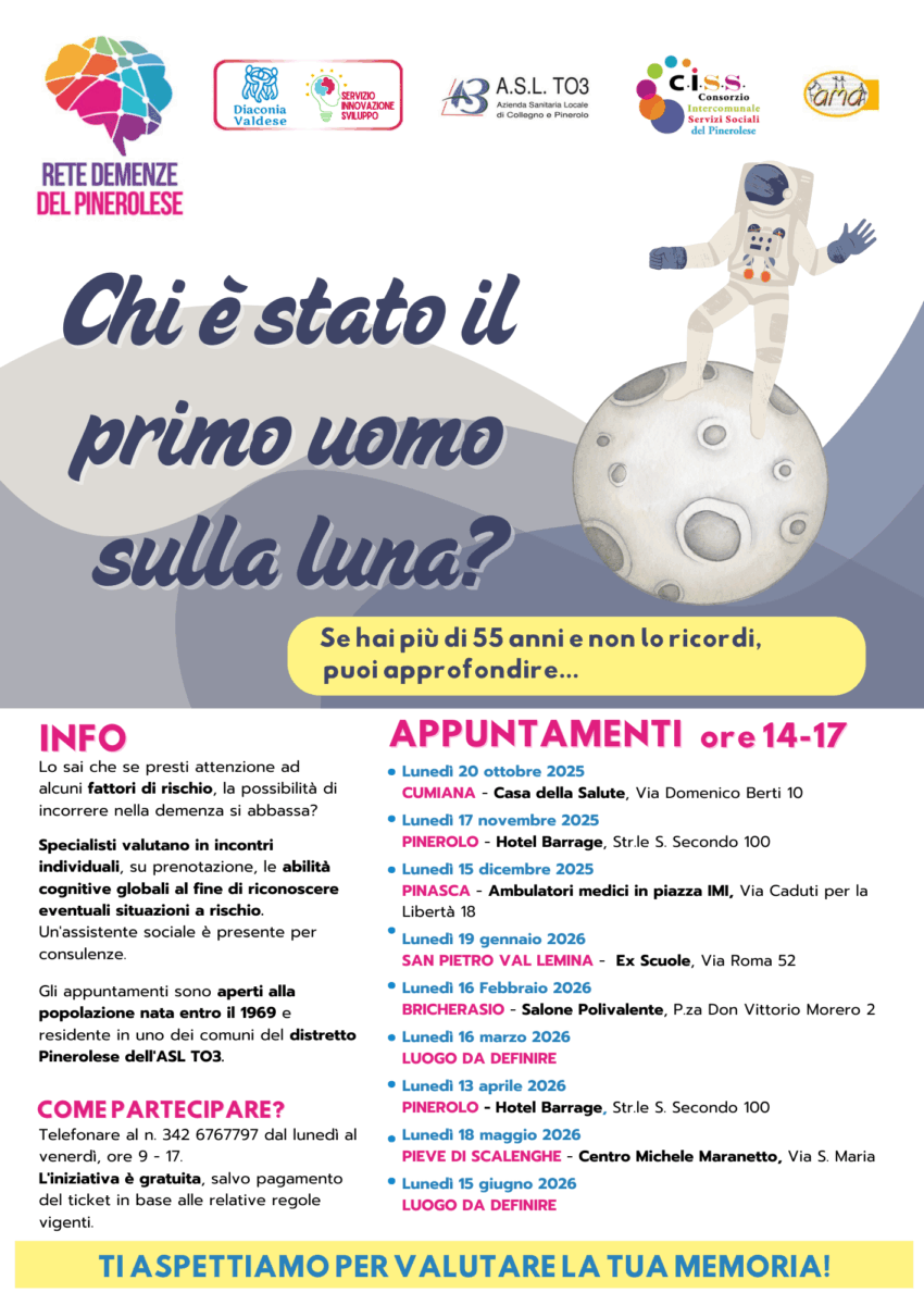 “La campagna di valutazione della memoria rivolta alla popolazione nel Pinerolese – afferma Alessandro Bonasea, Direttore del Servizio di Psicologia Clinica dell’ASLTO3 e Componente del Tavolo della Regione Piemonte per la definizione dei nuovi protocolli di intervento sulle demenze – rappresenta un intervento concreto di prevenzione che, dal 2018 ad oggi, ha permesso di valutare un numero molto alto di persone, contribuendo a individuare precocemente segnali di disturbi neurocognitivi e a promuovere stili di vita salutari. Da quest’anno, il progetto si rinnova con un format ulteriormente orientato alla prevenzione, concentrandosi sui principali fattori di rischio legati allo sviluppo delle patologie neurodegenerative, in linea con le evidenze scientifiche e le raccomandazioni delle linee guida nazionali. Si tratta di un percorso coerente anche con gli obiettivi del Piano Nazionale della Prevenzione, che sottolinea l’importanza di interventi mirati alla riduzione dei fattori di rischio e alla promozione del benessere cognitivo lungo tutto l’arco della vita’. ‘Il successo di questa iniziativa – prosegue il dottor Bonansea – è reso possibile anche grazie alla collaborazione con la Diaconia Valdese e con il CISS Pinerolese, partner storici sul territorio, che ci supportano nell’organizzazione e nella realizzazione delle campagne, contribuendo a garantire una presa in carico integrata e vicina ai cittadini.”