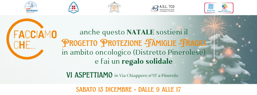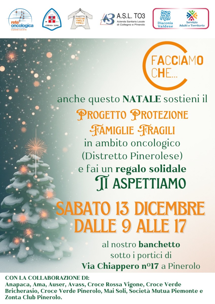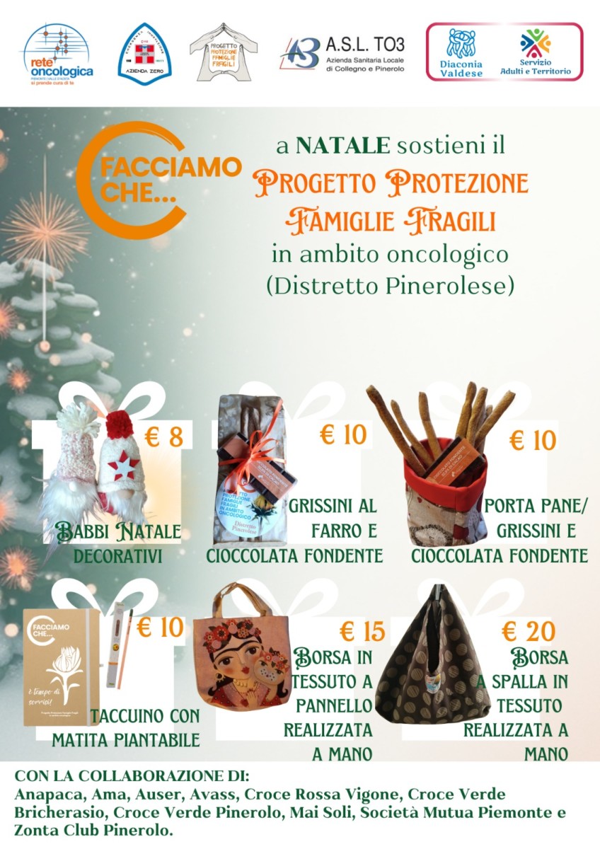 A Natale ci sono gesti che scaldano più delle luci e delle decorazioni. Anche quest’anno, sabato 13 dicembre, il Progetto Protezione Famiglie Fragili in ambito oncologicoDistretto Pinerolese scende in piazza, sotto i portici di via Chiappero, n.17, a Pinerolo, dalle 9 alle 17, con un banchetto ricco di proposte dedicate al Natale che non sono solo regali, ma opportunità di speranza e solidarietà.