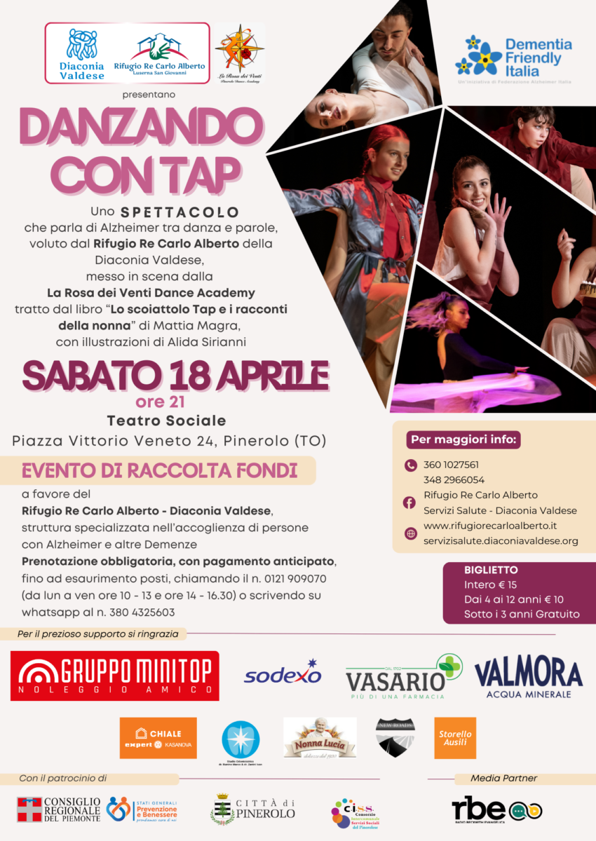 L’evento nasce da un’alleanza creativa tra il Rifugio Re Carlo Alberto, struttura d’eccellenza specializzata in Alzheimer e altre demenze, appartenente alla Diaconia Valdese – Servizi Salute e La Rosa dei Venti Dance Academy di Pinerolo. Insieme, queste due realtà hanno trasformato le pagine del libro illustrato “Lo Scoiattolo Tap e i racconti della Nonna” (scritto da Mattia Magra e illustrato da Alida Sirianni) in una narrazione potente fatta di passi di danza, musiche e parole. Un progetto che è il frutto di una grande lavoro di squadra: le coreografie di Claudia Filadoro