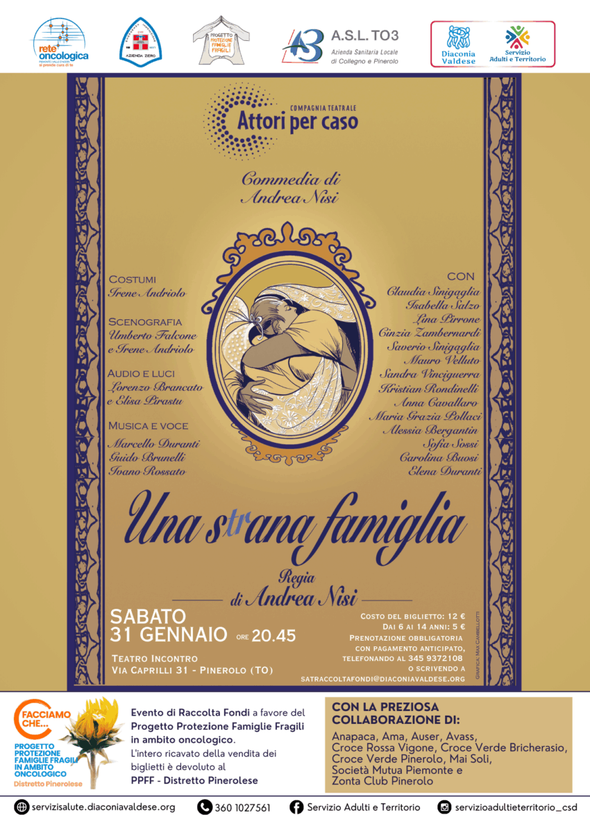 Lo spettacolo è un evento di raccolta fondi a favore del Progetto Protezione Famiglie Fragili in ambito oncologico. L’intero ricavato della vendita dei biglietti è devoluto al PPFF – Distretto Pinerolese.